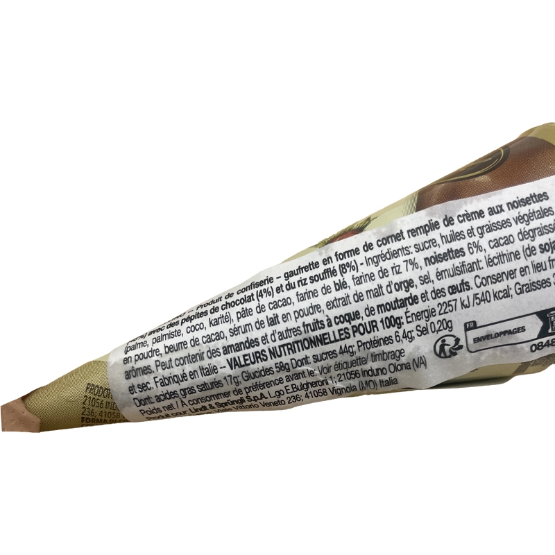 Avec ses 25 g de pur plaisir, ce mini cornet associe un cône croustillant à une crème gianduja onctueuse, élaborée à partir des meilleures noisettes du Piémont IGP. Un équilibre parfait entre texture et saveur, idéal pour les amateurs de chocolats fins et de douceurs italiennes.