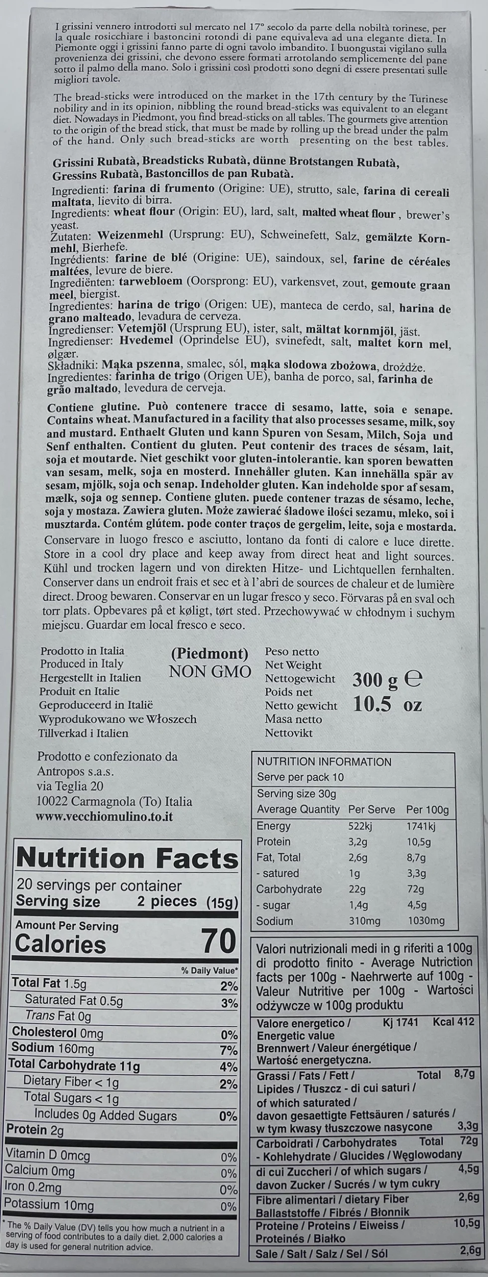 Découvrez les Gressins Piemontais Nature, de fines et longues baguettes croustillantes, typiques du Piémont.Préparés selon la recette traditionnelle italienne, ils sont dorés au four pour offrir un croustillant parfait et un goût authentique, légèrement beurré et délicatement salé.Idéaux pour l’apéritif, en accompagnement d’antipasti, ou à déguster simplement avec une touche de beurre ou de fromage.