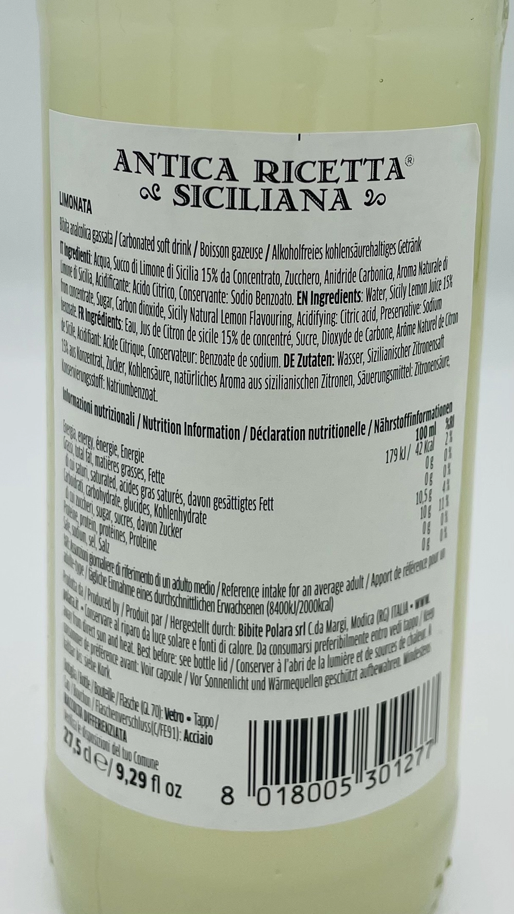 Retrouvez le goût authentique de la tradition italienne avec notre limonade sicilienne nature.Élaborée à partir d’eau gazéifiée, de sucre de canne et de citrons frais de Sicile, cette boisson rafraîchissante séduit par sa bulle fine, sa fraîcheur naturelle et sa légère acidité parfaitement équilibréeUne limonade simple, pure et pleine de soleil — le goût de la Sicile dans chaque gorgée.