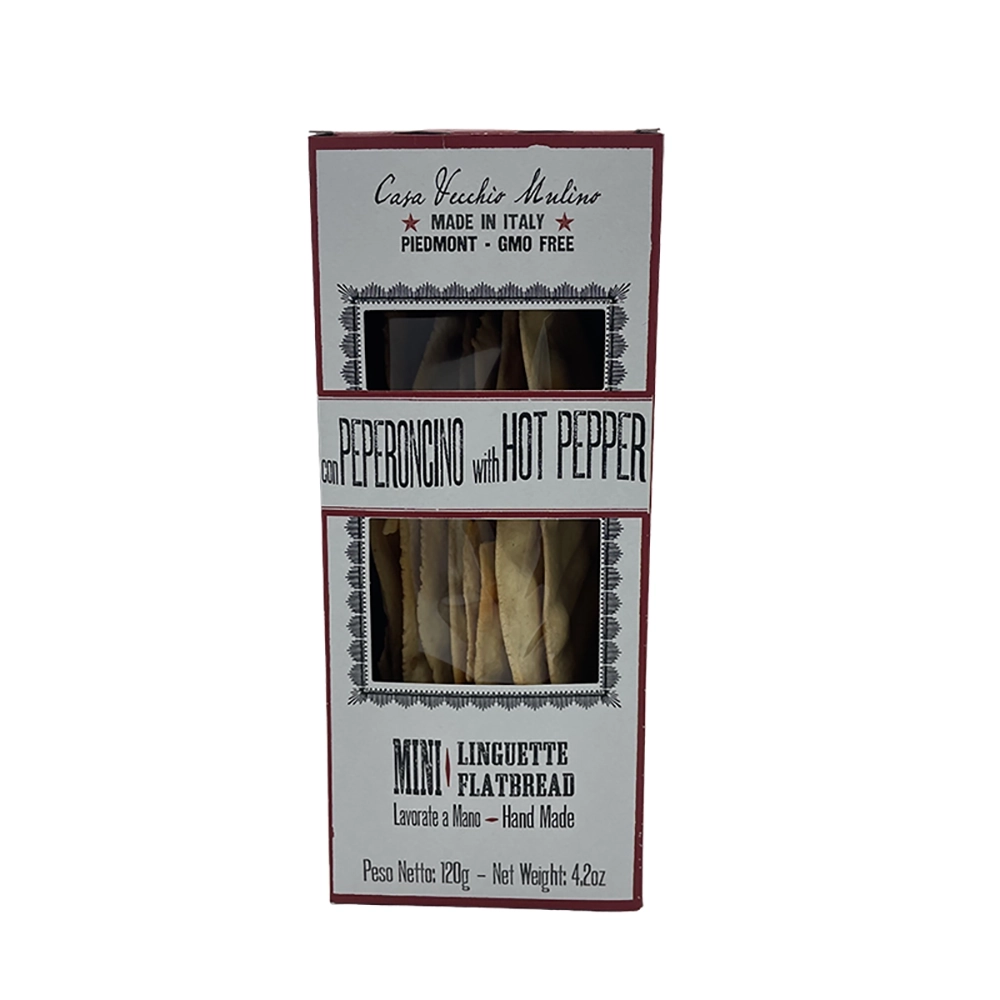 Savourez la délicatesse de nos Mini Linguette au piment, de fines et longues crackers typiquement italiennes, dorées au four pour un croustillant parfait.Préparées selon une recette artisanale du Piémont, elles allient la légèreté d’une pâte à pain fine et la chaleur du piment méditerranéen.Idéales pour l’apéritif, les planches de charcuterie, ou à grignoter tout simplement