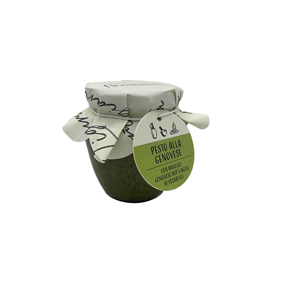 La recette est élaborée à partir de basilic génois D.O.P., d’huile d’olive vierge extra, de pignons de pin, de noix, de fromage Grana Padano D.O.P., de sel marin et d’ail Vessalico (une Sentinelle Slow Food).Elle se distingue par sa couleur vert clair et sa saveur corsée et distinctive.Son arôme et son goût intense sont le fruit de la qualité des matières premières utilisées et du développement d’un procédé de fabrication sans pasteurisation, garantissant une conservation de 18 mois à compter de la date de production.